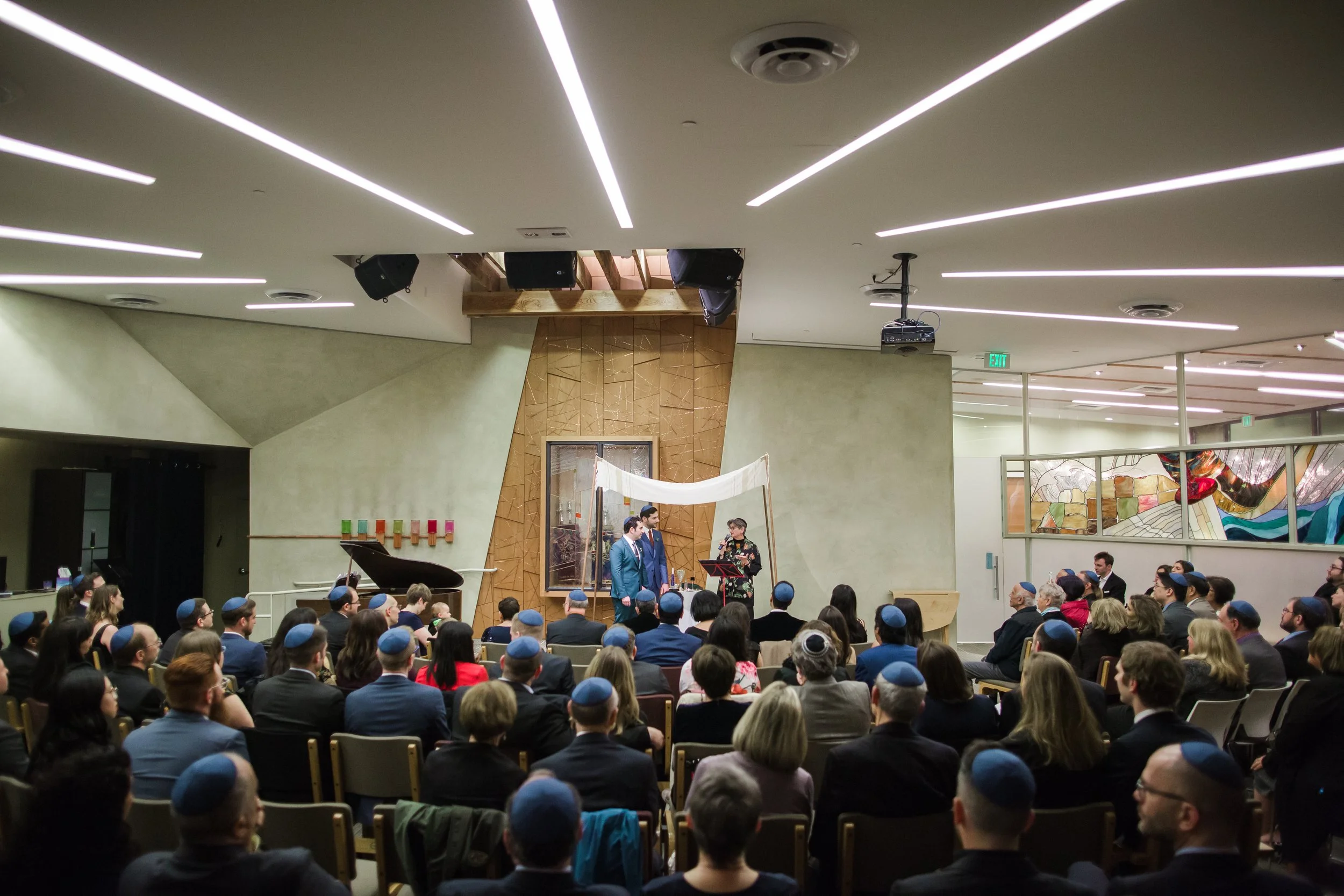 💚Amir & Jordan💙 met by happenstance when, at the urging of their friends, they attended the same gay Hanukkah 🕎 party. They are very close to their families and friends and knew they wanted to share an afternoon ceremony with them at their synagogue, Beth Chayim Chadashim (@templebcc). Afterward, they let loose at the stunning Pico Union Project (@picounionproject), partying deep into the pleasantly drizzling night. 🌜🌧 .