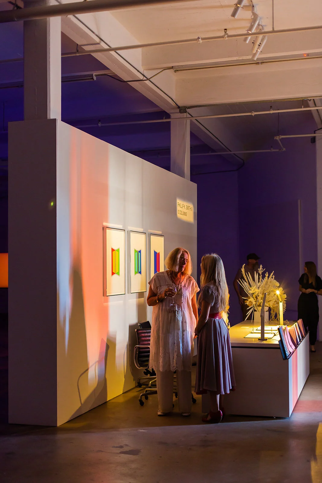 “Commissioned for the inaugural exhibition of Bridge Projects, 10 Columns features Smith’s signature mirrored surfaces and dynamic light program. Expanding on past site-specific installations, the artist adjoined mirrored rectilinear forms to the colonnades of Bridge Projects’ site at Santa Monica Blvd and Highland creating an architecture inside the existing one. The modular structure consists of thirty forms of equal heights and three distinct widths, adhering to the ten concrete columns in unique combinations of 90 and 180 degree angles that shift between aligning with and disrupting the grid of columns. The forms are animated by Smith’s patented light program. As the surfaces emit gradations of light and color, the dimensions and experience of the room shift and blur, evoking the changes of light in the Los Angeles atmosphere throughout the day. Recalling both LA’s Light and Space movement and ancient cosmologies, light is a resonant image for the beginning of Bridge Projects.”