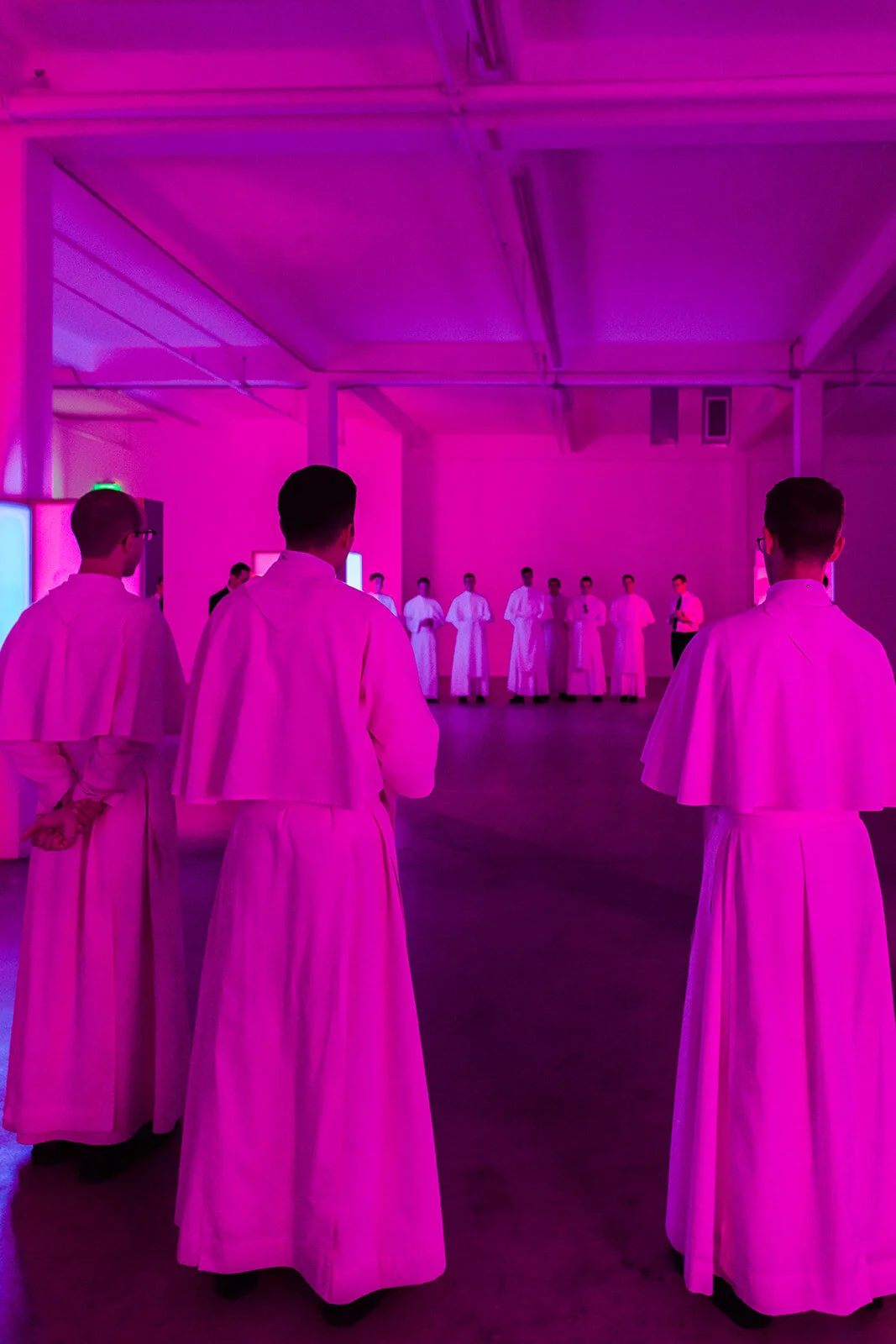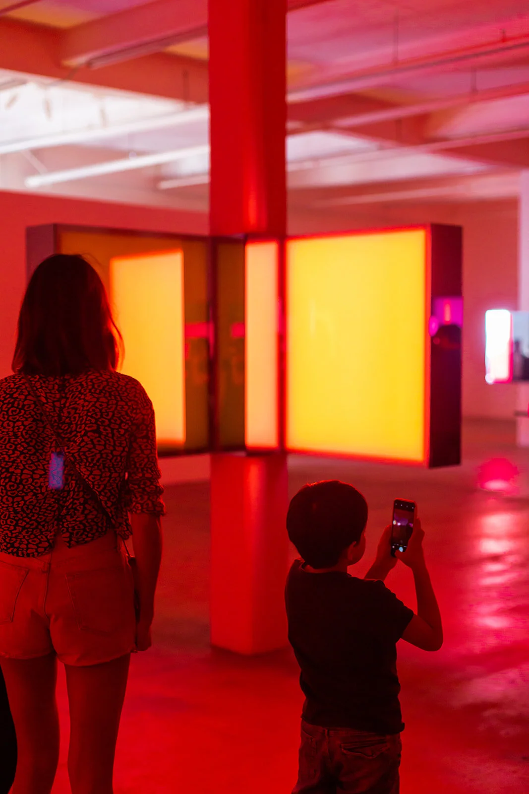 (Yup, those are novices from Saint Michael’s Abbey exploring the shifting light of Phillip K. Smith’s installation.)