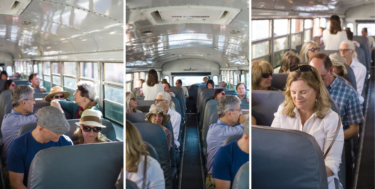 Above (Left): In a gesture of solidarity, the group poses for a photo for Carolina Caycedo with a handwritten sign that reads “#Somoselrio”, which translates to “We Are The River”. / Below: For the second half of the fundraiser event, attendees board a school bus for a guided tour of The Bowtie Project.