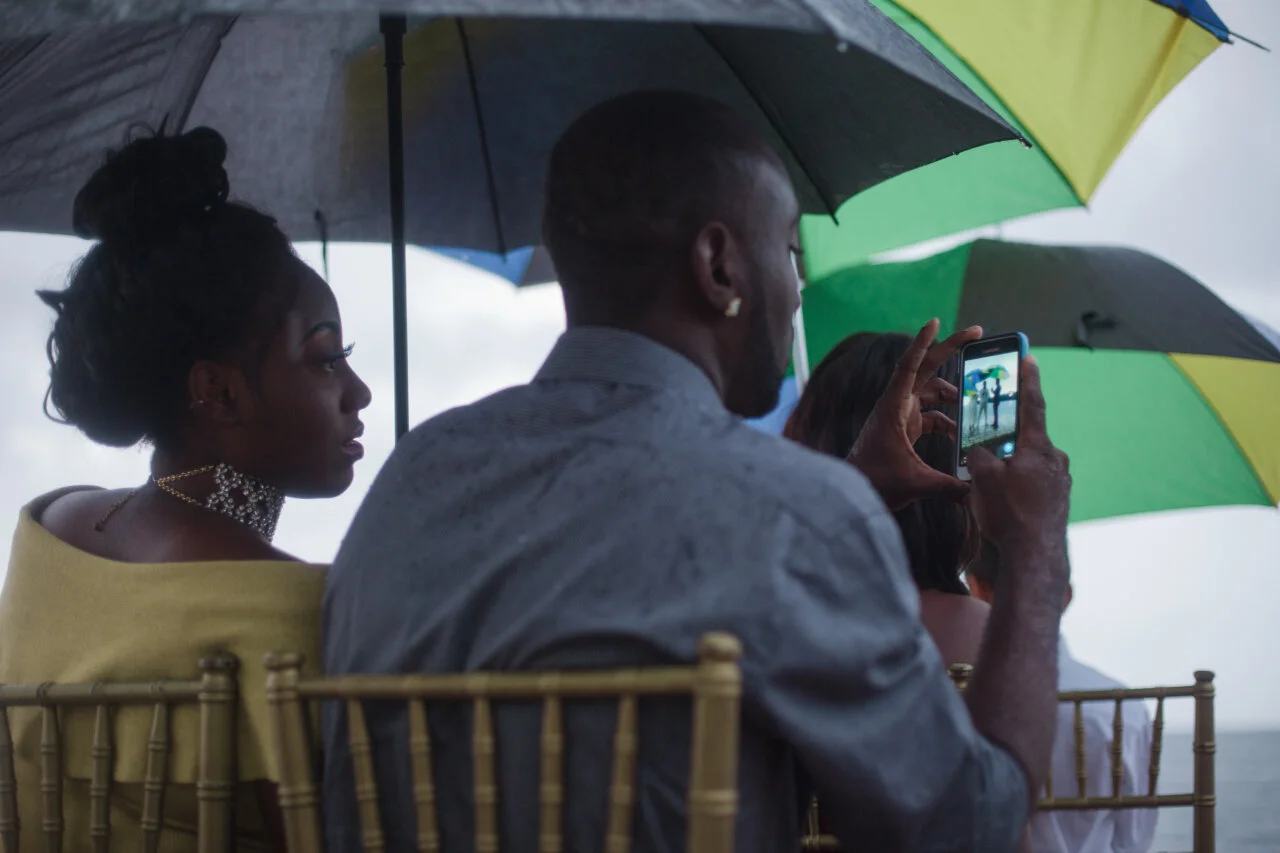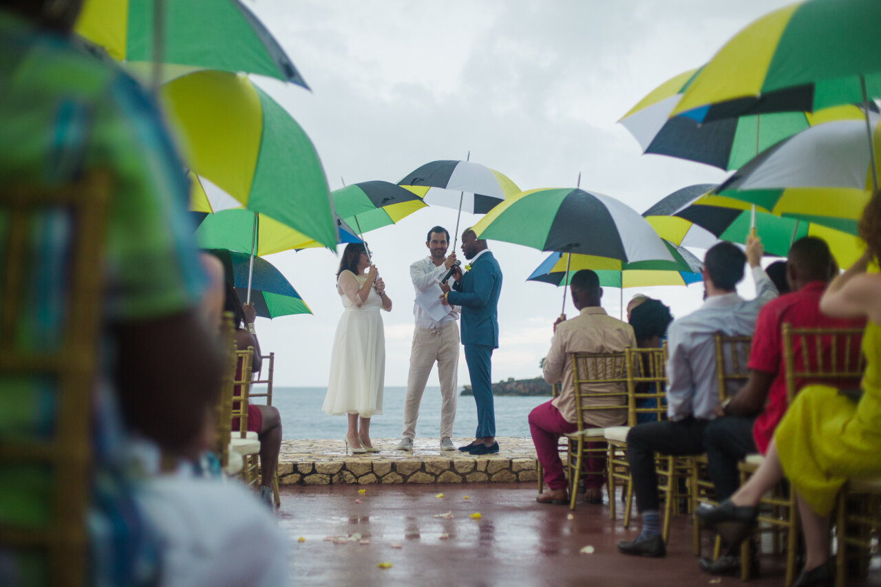 The first part of the day was sunny and clear, but the clouds and tropical rain slowly rolled in, off and on, by the time of the ceremony start. The rain was light and warm and the guests collectively agreed that the ceremony should not be interrupted from its outside location when the rains started up again. It’s hard to explain, but we were all so giddy, laughing and smiling as we got a little Carribean good luck sprinkled on the day. I crouched in and out of various umbrellas to capture everything around me, but still was pretty soaked by the end of the ceremony. I even considered shooting the ceremony barefoot so I could ditch my water-logged slippers. I will never forget Alex coming down the aisle and saying with a relaxed laugh, “Oh my”, realizing the absurdity of it all, and how it all was just so charmed and worked out as it should.